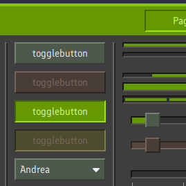 This theme's colors are equal to Simple theme, which are very similar to another theme of mine called Soil. That is: dark theme, with gray backgrounds, green accents, brown disabled elements, and blue hints or statuses. Buttons are lighter and subtly green.